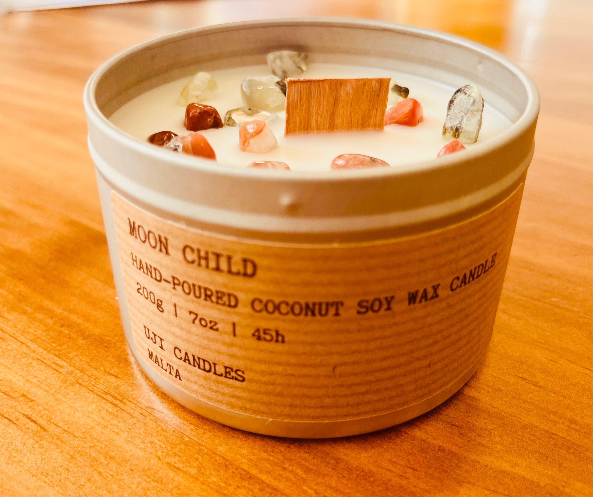 Ingredients Our candles are all made with 100% vegan coconut and soy wax, fine fragrance oils, and wooden wicks. The fragrances we use are paraben-free, phthalate-free, and are never ever tested on animals. Moon Child candles contain natural crystals and fragrances of grapefruit, bergamot, thyme, white tea, nutmeg, rose, honey, tuberose and jasmine.